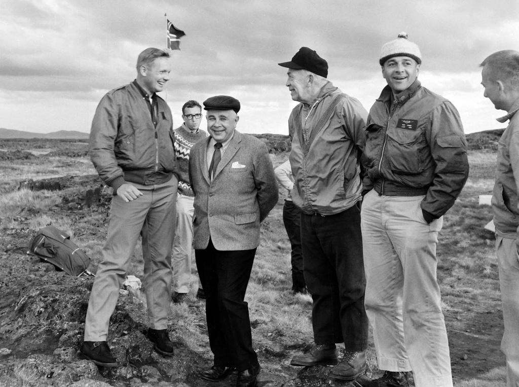 This year marks 50 years since the first group of Apollo astronauts traveled to Iceland for geology field training. Astronauts Anders, Bassett, Bean, Cernan, Chaffee, Cunningham, Eisele, Schweickart, Scott, and Williams arrived in Iceland on July 12, 1965, and spent a week exploring the barren highlands and volcanic geology of Iceland. The astronauts had already trained at the Grand Canyon, in Hawaii, Alaska, at the Meteor Crater in Arizona, and at other places around the US, but they felt that Iceland was the most moon-like of the field areas.